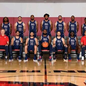 第二排从左至右依次是:助教格兰特-希尔、助教泰伦-卢、伦纳德、塔图姆、杜兰特、恩比德、浓眉、阿德巴约、爱德华兹、助教马克-费尤(冈萨加大学主教练)